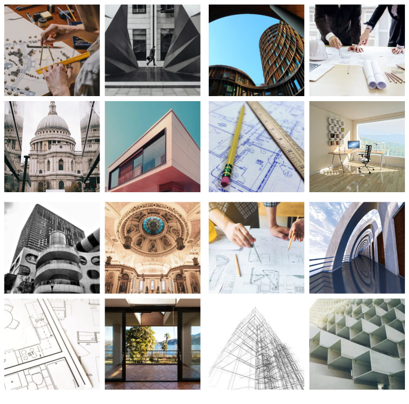 Construction plans; construction sites; models; books; renderings; photographs of buildings and monuments; paintings.