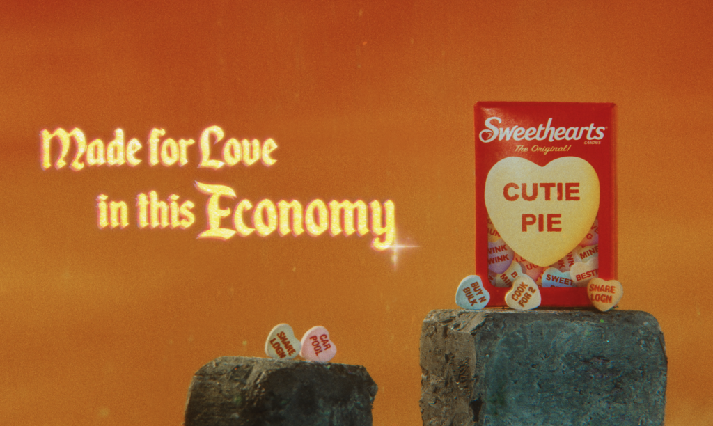 Sweethearts, the iconic conversation heart candy produced by Spangler Candy Company, partnered with agency Tombras to launch "Love in This Economy," a campaign that replaced traditional romantic candy phrases with pragmatic sayings such as "SPLIT RENT," "COOK FOR 2," "BUY N BULK," "CAR POOL," and "SHARE LOGN." The initiative acknowledged that financial pressures increasingly shape how people experience romance, repositioning the brand from sentimental nostalgia toward culturally resonant humor rooted in economic reality.