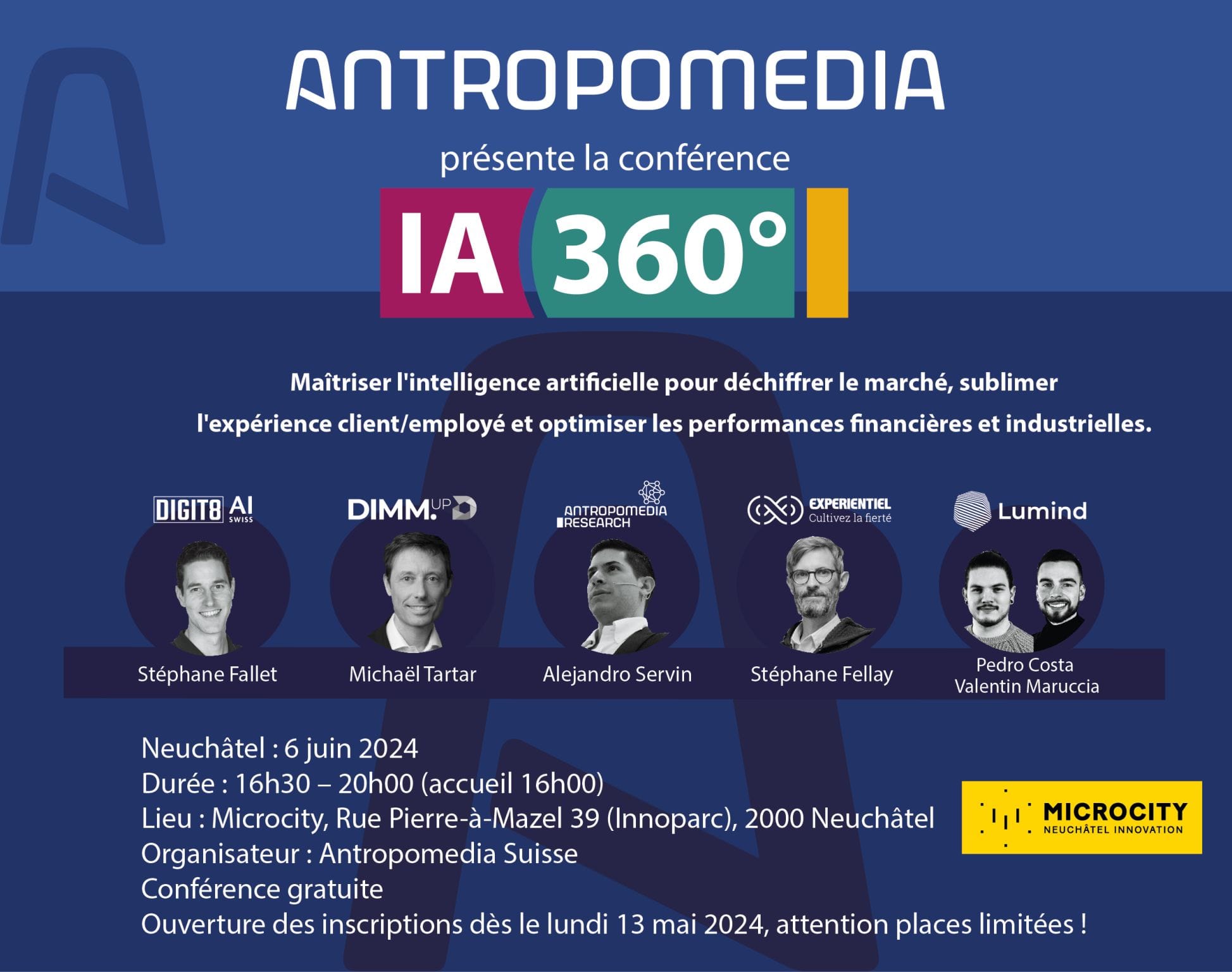 Antropomedia presents AI 360° CONFERENCE: Mastering artificial intelligence to decipher the market, sublimate the customer/employee experience, and optimize financial and industrial performance.